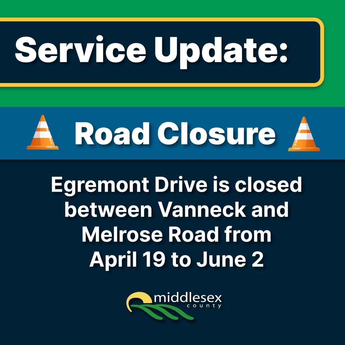 Egremont Drive is closed between Vanneck and Melrose Road at the bridge for repairs and will be closed from April 19 to June 2.